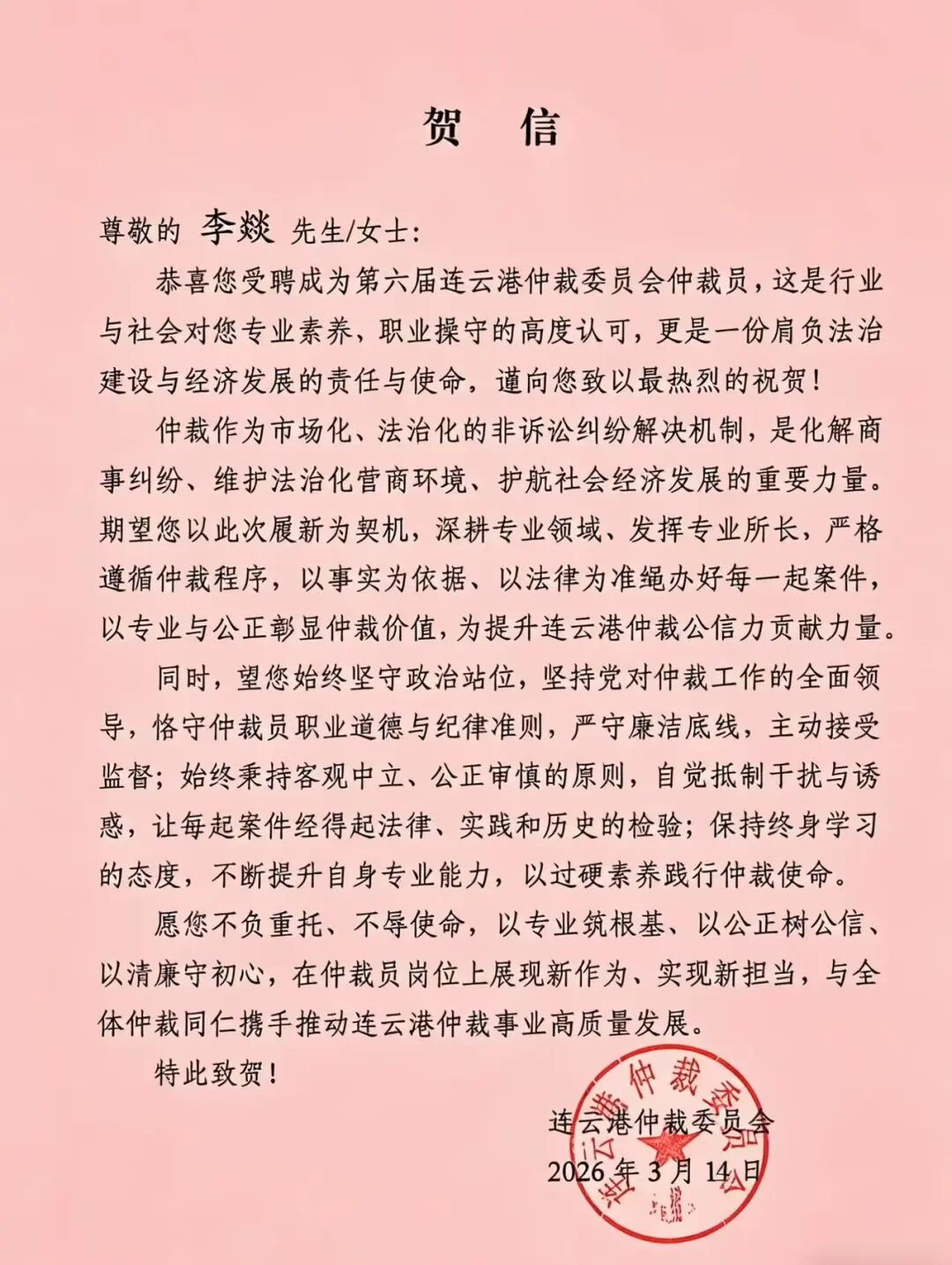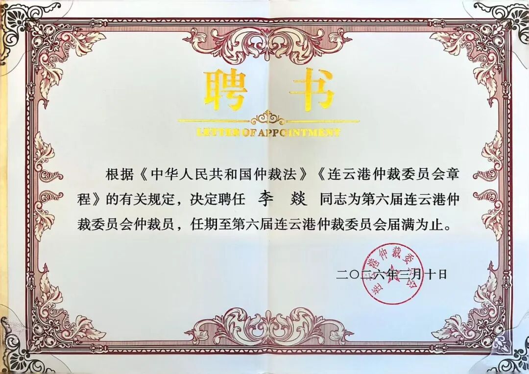 近日,随着连云港仲裁委员会贺信传来,本所权益合伙人李燚律师凭借深厚的法学功底、丰富的实务经验以及良好的职业声誉,两个月内连续获聘唐山、吉安、连云港等仲裁委员会仲裁员,这既是对其专业能力的高度认可,也是行业对本所法律服务水平的充分肯定,彰显了本所在商事争议解决领域的雄厚实力。